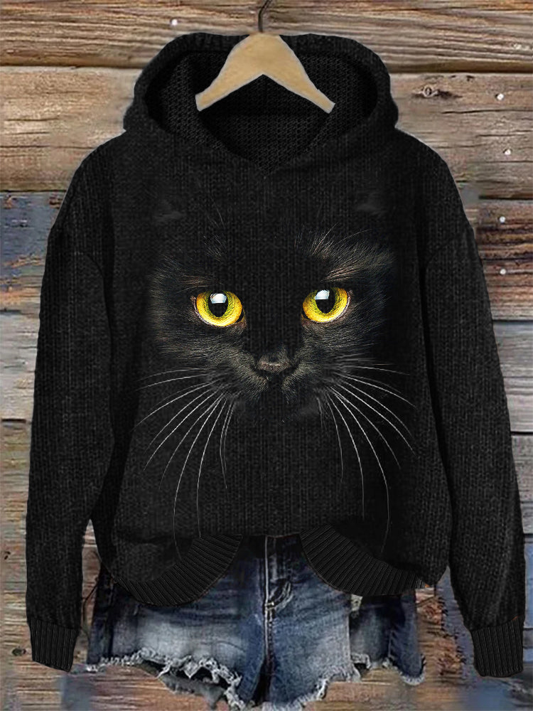 Black Cat Face Cozy Knit Hoodie