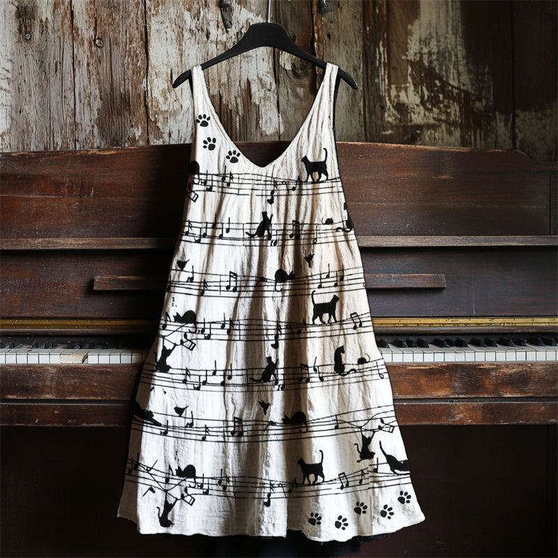 Black Cats & Paw Prints Sheet Music Linen Dress