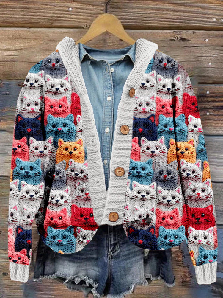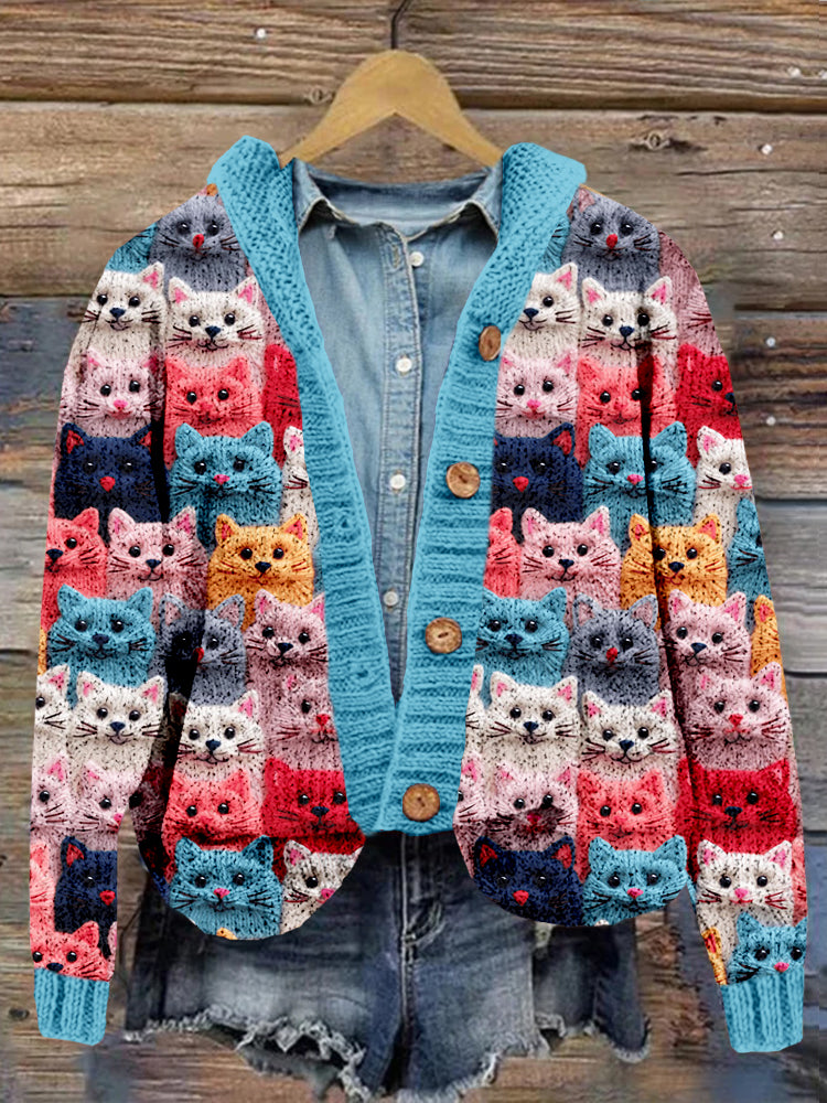 Colorful Cute Cats Embroidered Cozy Hooded Cardigan
