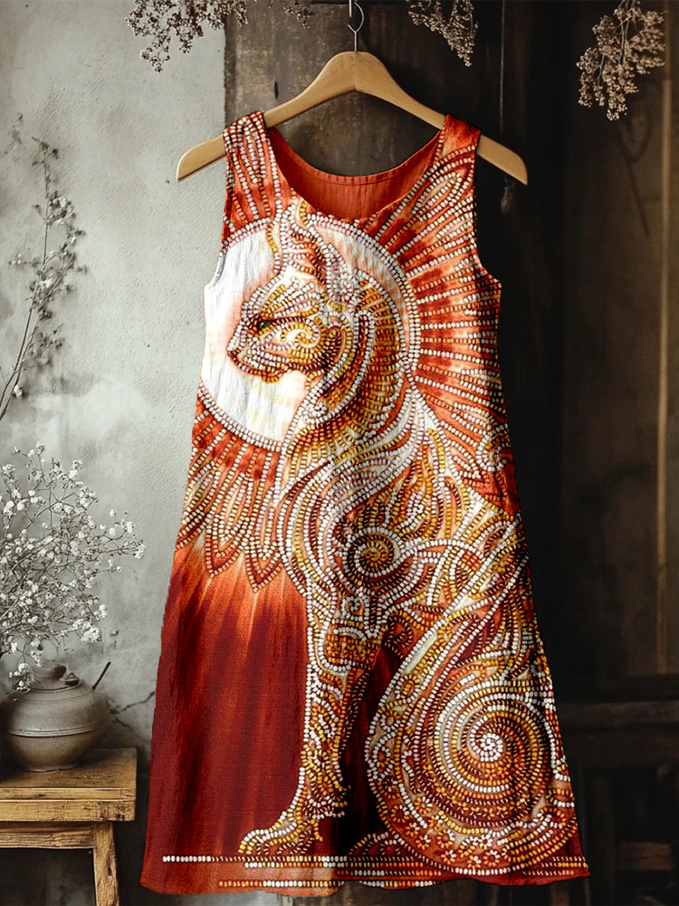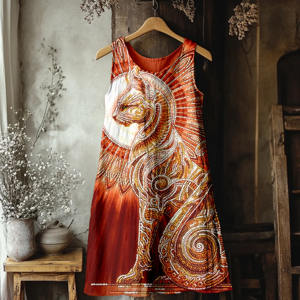 Egyptian Cat Goddess Bast Bead Embroidered Linen Midi Dress