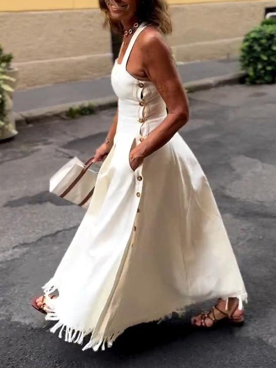 This elegant sleeveless maxi dress features a chic square neckline and a flattering fitted bodice. The side button detailing adds a touch of sophistication while allowing adjustable styling. Designed with practical side pockets and a fringed hemline, it perfectly blends classic elegance with modern flair. Ideal for summer outings, garden parties, or casual evening gatherings.