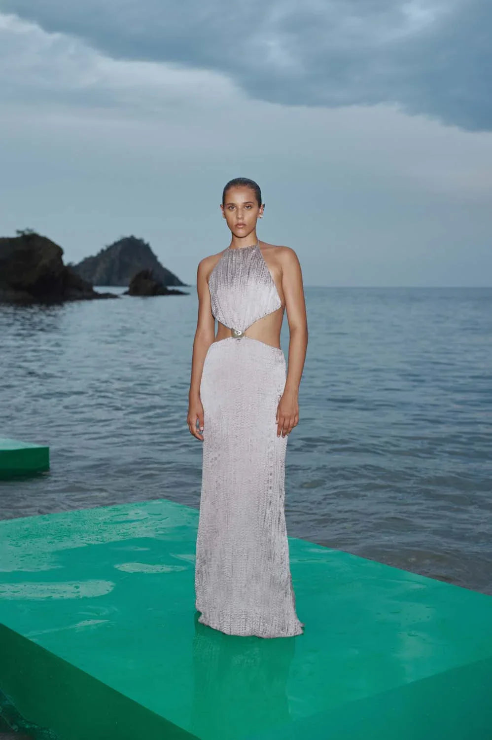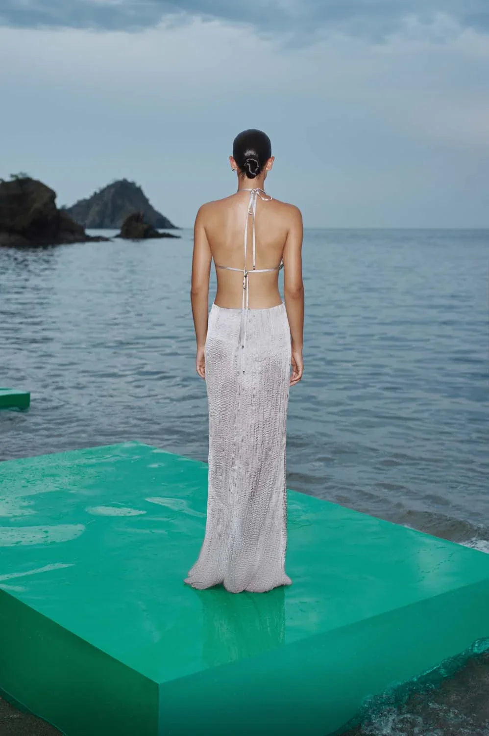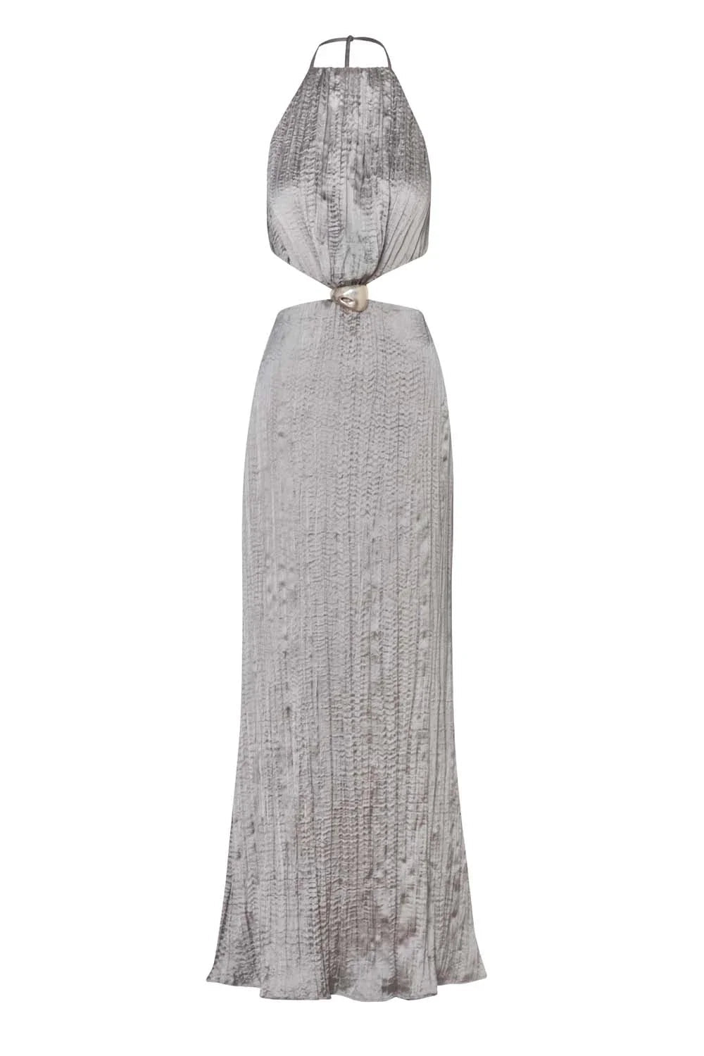 - Stunning Design: A bold and modern Maxi Dress Silver in Satin, featuring a halter neck, open back, and side cut-outs for a striking look.