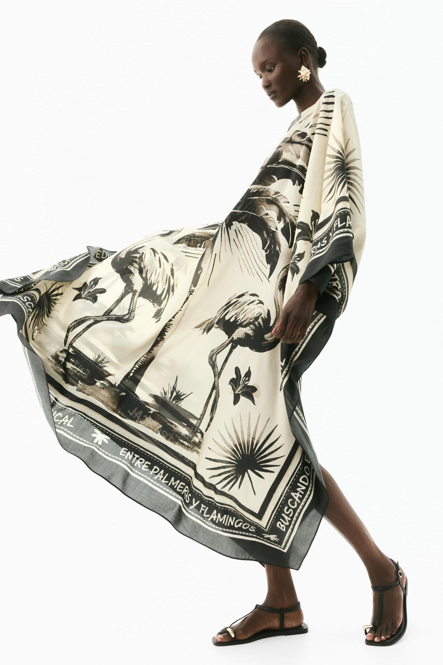This oversized flamingo caftan dress flows gracefully with an elegant silhouette, making it the perfect choice for effortless holiday style. Featuring a playful flamingo and palm tree print on a light beige and black base, this caftan is crafted from a blend of 30% lyocell and 70% recycled polyester, offering a lightweight and beautifully draping texture. The relaxed fit, side slits, and 3/4 sleeves create a breezy, flowing movement, ideal for watching sunrises and sunsets in comfort and style.