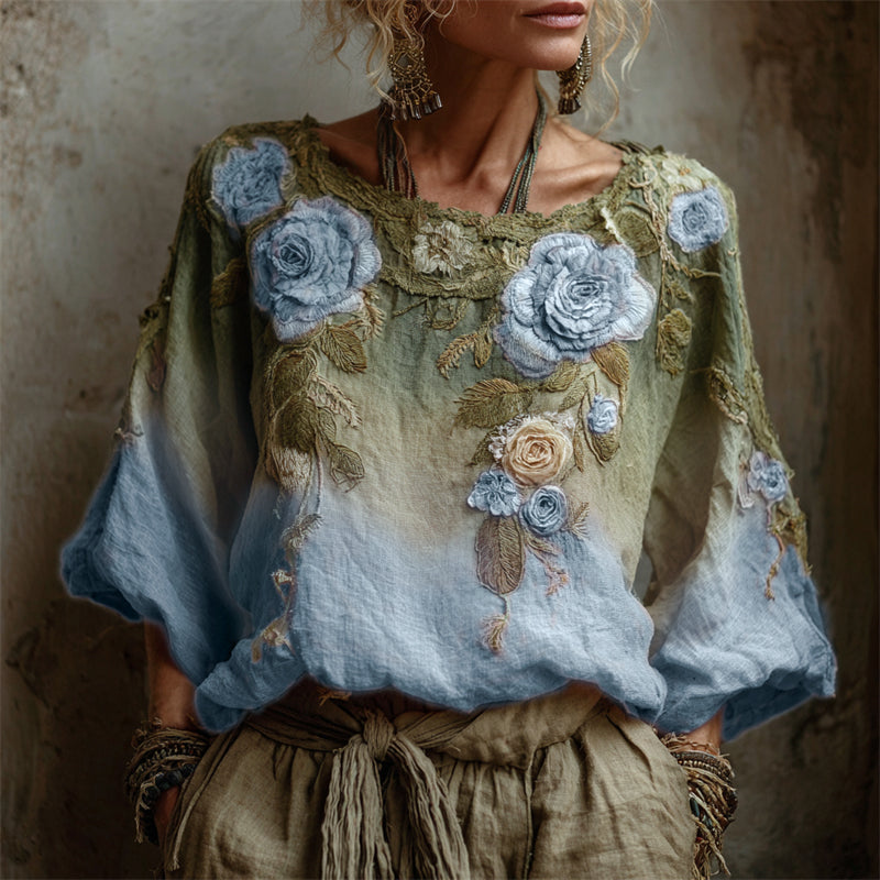 Vintage Pink Roses Forest Gradient Linen Tunic