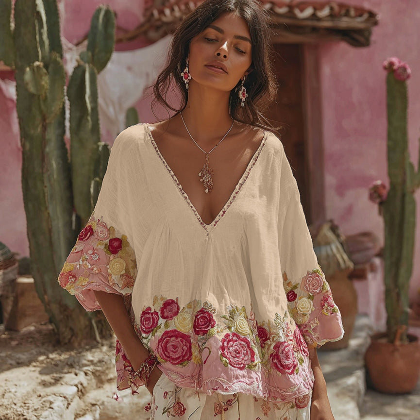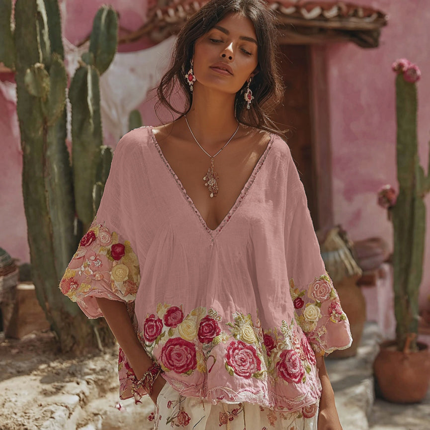 Women's Vintage Floral Art Embroidery Linen T-shirt